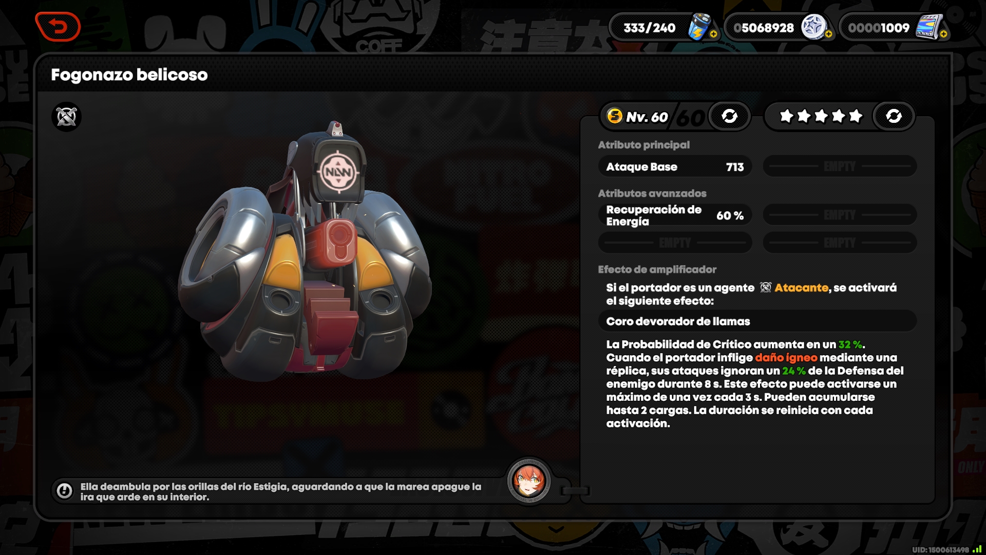- El Daño Crítico aumenta en un 30 (48) %. Cuando el portador golpea a un enemigo con un ataque normal, una técnica especial o una réplica, puede obtener por separado 1 carga de bonificación. Cada carga de bonificación hace que el Daño Crítico del portador aumente en un 10 (16) % adicional durante 30 s. Pueden acumularse hasta 3 cargas. La duración de cada carga es independiente. Puede activarse un máximo de una vez por cada habilidad. Al contar con 3 cargas, el daño eléctrico del portador aumenta en un 20(32) %.